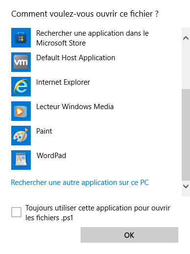 N'oubliez pas de cocher la case Toujours utiliser cette application pour ouvrir les fichiers .ps1 !